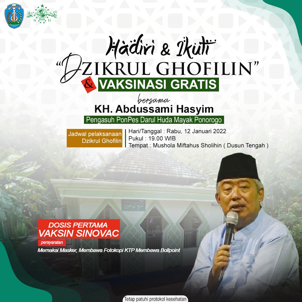 “Kita telah menyiapkan 100 dosis vaksin Sinovac untuk kegiatan Dzikrul Ghofilin ini. Dalam pelaksanaan vaksinasi ini kita tetap berpedoman pada standar Operasional prosedur (SOP) yang telah ditetapkan, termasuk dalam penerapan pandemi corona virus.” katanya.