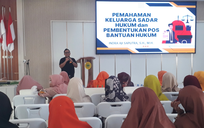 Ketua Panitia, Dra. Dian Aksanti, M.Pd., menjelaskan bahwa sosialisasi ini menghadirkan dua materi utama, yaitu pemahaman tentang Kadarkum dan pembentukan Pos Bantuan Hukum (Posbakum), serta hukum waris dalam keluarga.