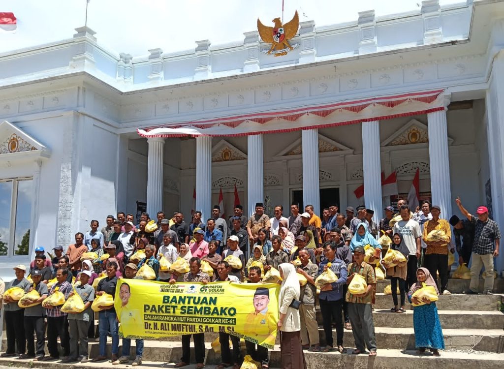 “Sesuai instruksi DPP, seluruh kader Golkar di Indonesia diwajibkan melaksanakan pembagian sembako dalam rangka HUT ke-61. Ini adalah bentuk nyata kepedulian Partai Golkar kepada masyarakat,” ujar H. Ali Mufthi saat menyerahkan paket sembako di Wagil Lor, Ngebel.