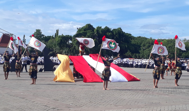 Istimewanya, apel besar ini diwarnai dengan penampilan Tari Kolosal “Sang Dewantara” yang dipersembahkan oleh MGMP Seni Budaya.