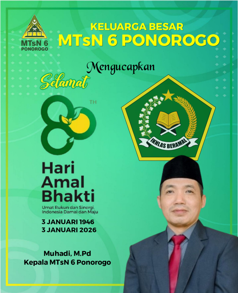 Home Ponorogo Keluarga Besar MTsN 6 Ponorogo Mengucapkan Selamat Hari Amal Bakti Kementerian Agama... DaerahPonorogo Keluarga Besar MTsN 6 Ponorogo Mengucapkan Selamat Hari Amal Bakti Kementerian Agama Ke-80 By Redaksi Media Ponorogo - January 3, 2026 0 Facebook Twitter Google+ Pinterest WhatsApp