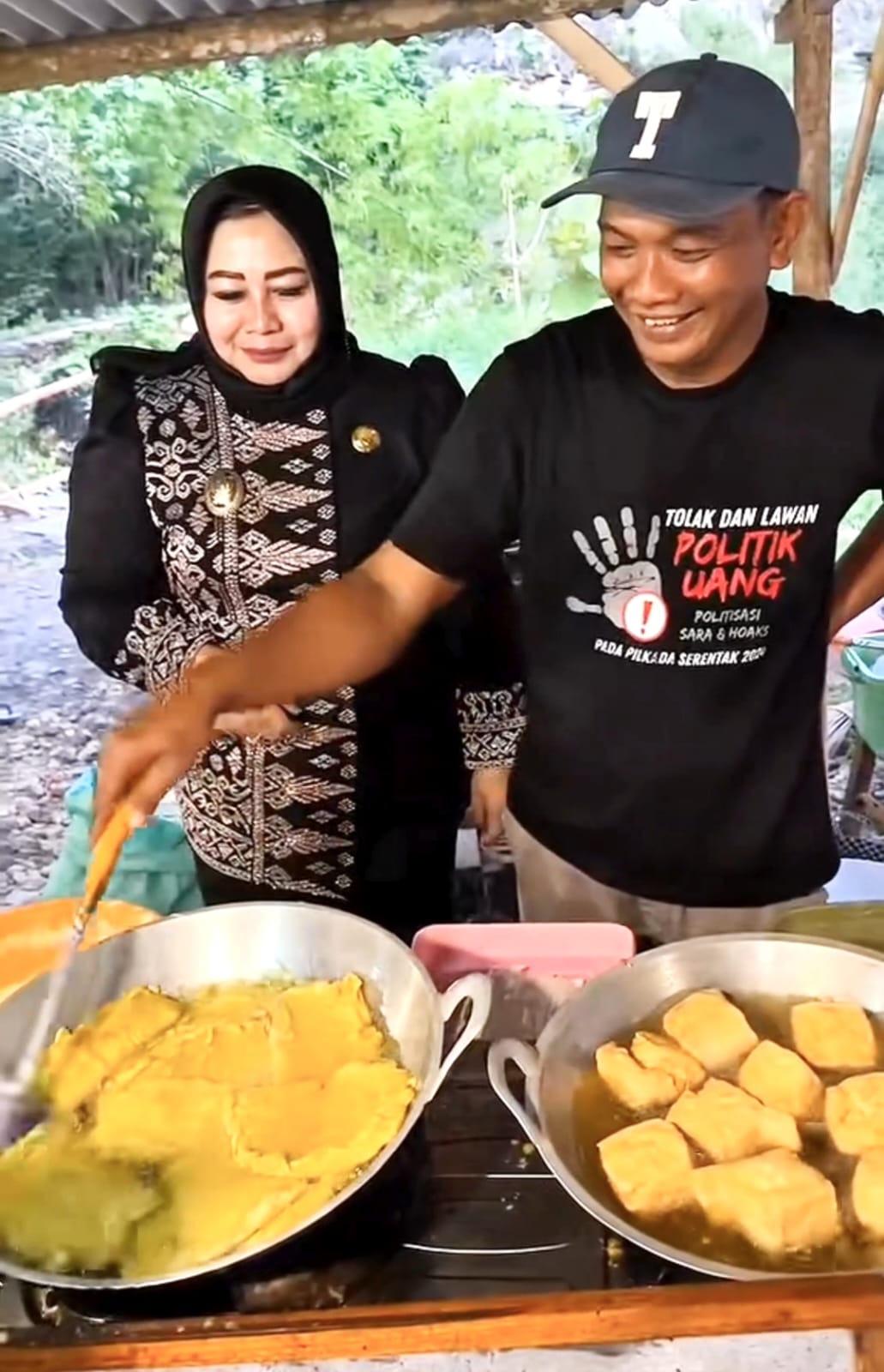 Bunda Lis –sapaan akrabnya – ditemani Sumarno untuk melihat langsung proses pembuatan tempe goreng khas dan bahkan memborong banyak untuk dibagikan.