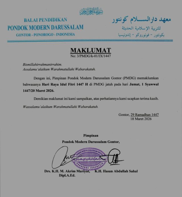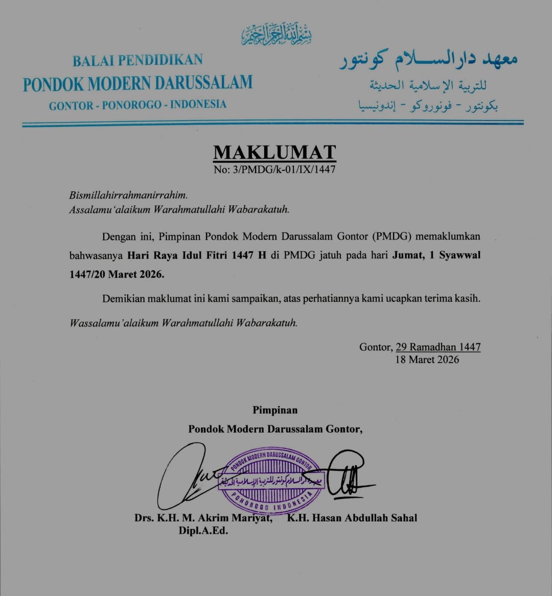 ”Pimpinan Pondok Modern Darussalam Gontor (PMDG) memaklumkan bahwasanya Hari Raya Idul Fitri 1447 H di PMDG jatuh pada hari Jumat, 1 Syawwal 1447/20 Maret 2026,” tulis pernyataan resmi tersebut.