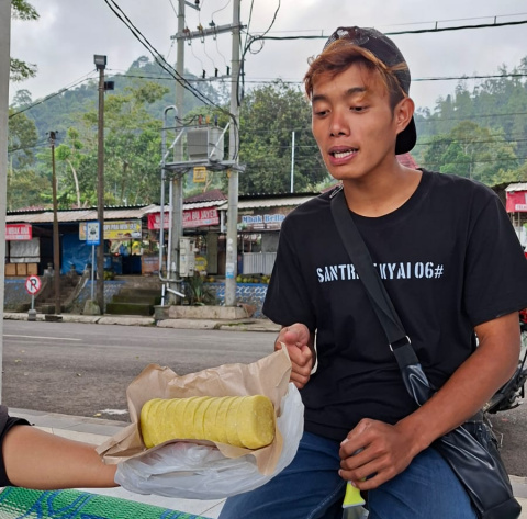 “Ini roti Jepang yang dikirim Thailand lewat iminoto Pulau Jawa, nggih niku getuk telo, Pak!” serunya kepada pengunjung.