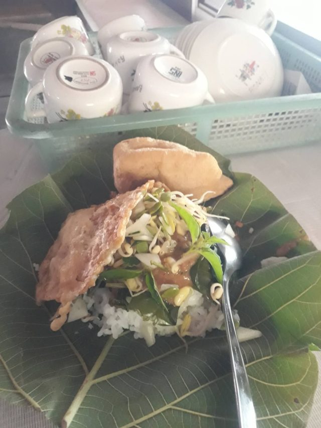 Tak hanya soal alas makan, detail sayurannya pun unik. Pecel ini menggunakan kecambah atau capar panjang, jenis sayuran yang kini mulai jarang ditemukan di pedagang pecel kekinian.